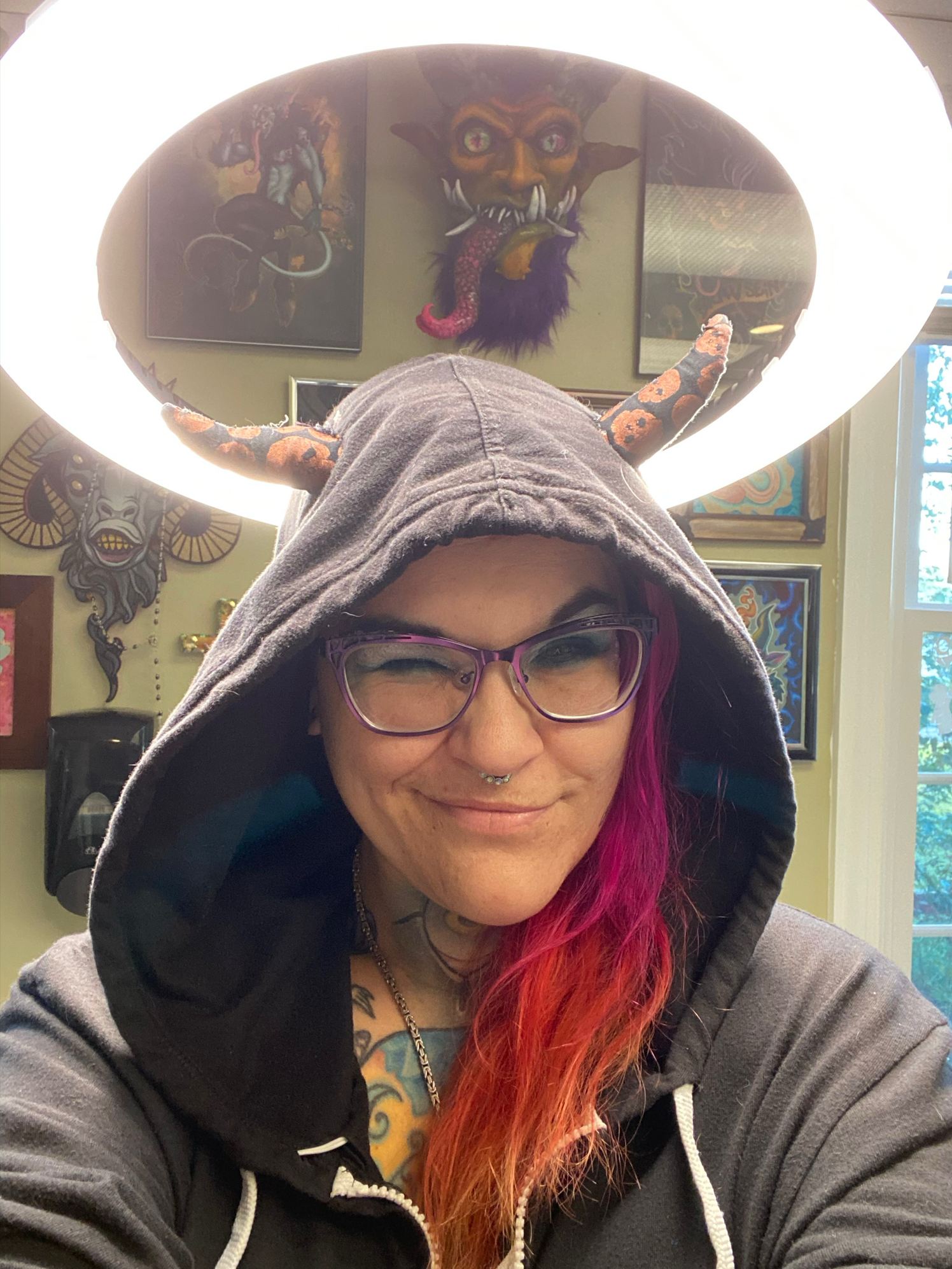 Kris is a Colorado-born tattoo artist with a love for comic books, RP games, and all things nerdy. Tattooing since 2006, she’s known for her bold personality, unmatched creativity, and expertise in anatomy-focused and custom tattoo designs. Kris blends humor, quirkiness, and artistic talent to create unforgettable tattoos that reflect her clients’ unique stories. Proudly embracing her “gremlin” nature, mismatched socks, and offbeat charm, Kris offers a fun, one-of-a-kind experience for anyone seeking original and edgy tattoo art.